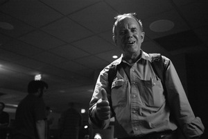 The photograph captures a cheerful older man giving a thumbs-up, embodying a spirit of encouragement and positivity. His bright smile contrasts with the darker background, creating a sense of warmth amidst the subtle shadows. The use of black and white enhances the emotional depth, drawing attention to the joyful expression and lively atmosphere of the moment.