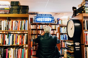 A solitary figure in a black leather jacket stands before a row of bookshelves, engulfed in a sea of vibrant book spines. The glow of a vintage 'History' sign casts a warm light, enhancing the nostalgic atmosphere of the bookstore. The composition invites reflection, as the subject seems captivated by the stories waiting to be rediscovered.
