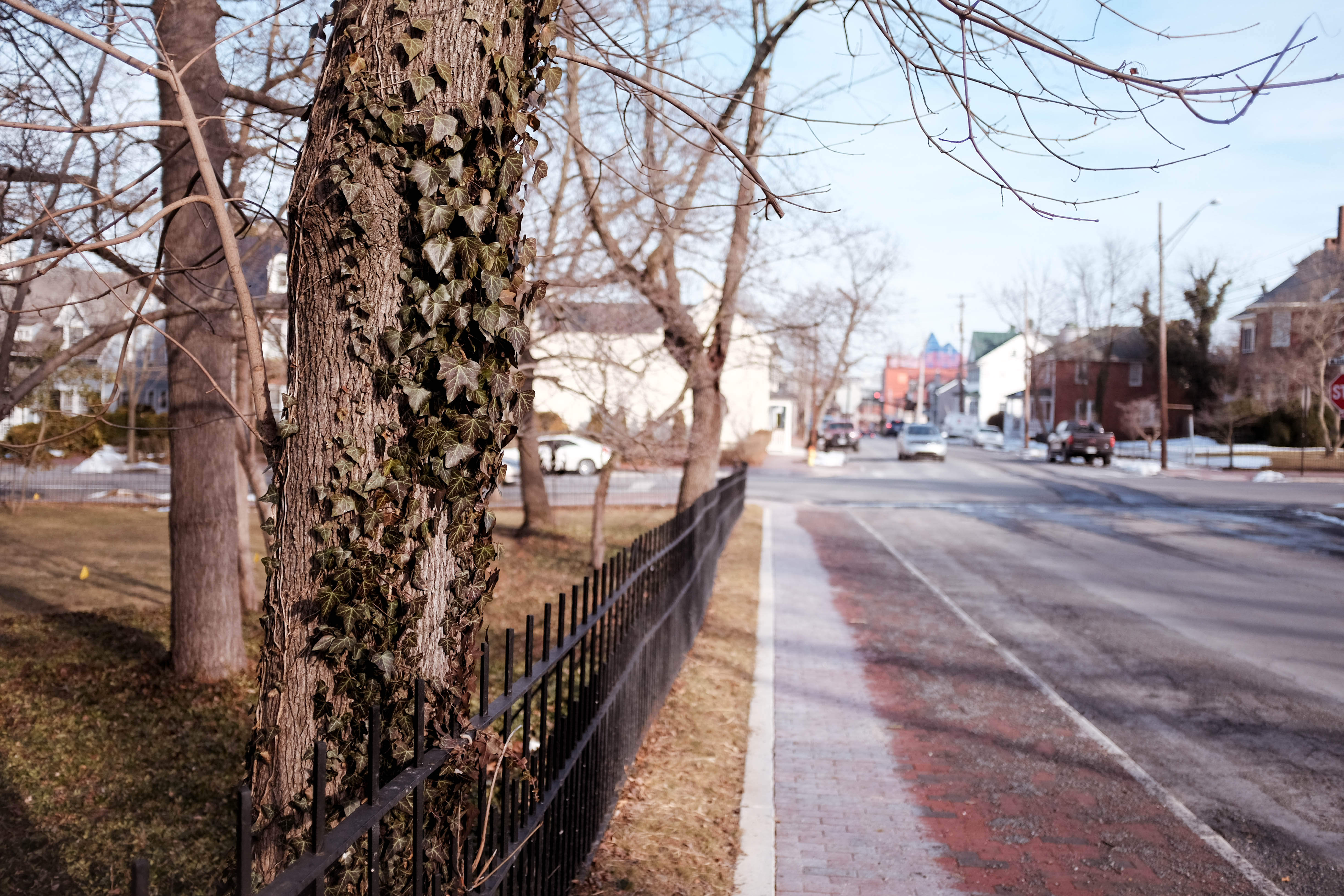 The photograph captures a quiet street scene, framed by a tree entwined with ivy, suggesting a blend of nature and urban life. A sense of tranquility envelops the setting, highlighted by soft, natural light that bathes the scene in a gentle warmth. The simplicity of the composition invites the viewer to pause and reflect on the hidden beauty of everyday surroundings.
