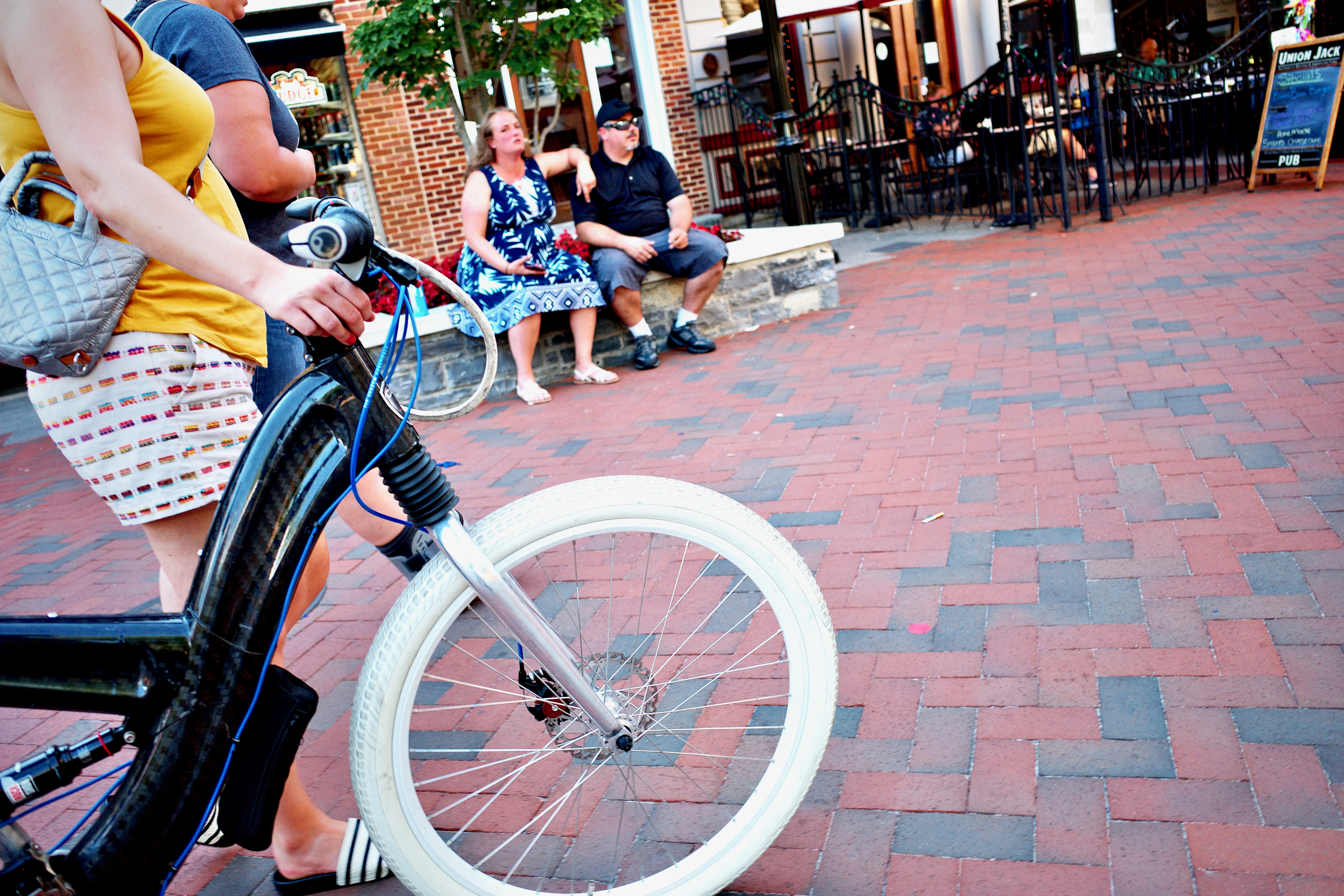 In this vibrant street scene, a cyclist is captured mid-motion, her bike prominently in focus as she rides past seated couples enjoying the summer ambiance. The warm lighting casts a lively glow over the brick pavement, enhancing the relaxed mood of the outing. The composition draws the viewer's eye along the path ahead, inviting a sense of adventure and community in a bustling urban setting.