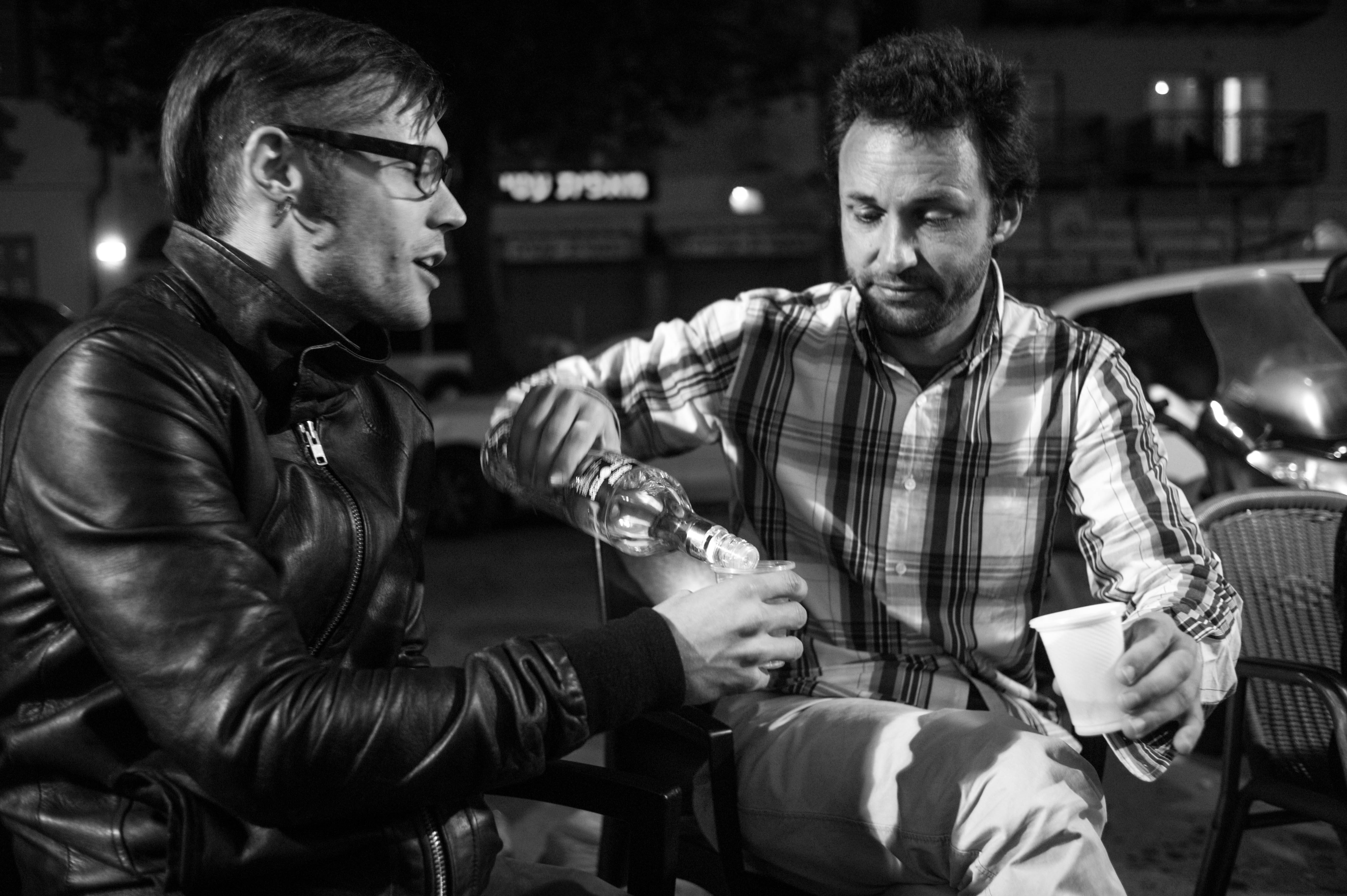 In this black-and-white photograph, two men sit closely together, engaged in a moment of camaraderie as one pours liquid into a cup, creating a sense of intimacy and spontaneity. The low, ambient lighting casts soft shadows, heightening the mood of a relaxed outdoor gathering, while the contrasting textures of their clothing emphasize their different personalities. The composition draws the eye to the interaction, encapsulating the warmth of friendship against the backdrop of a bustling night.