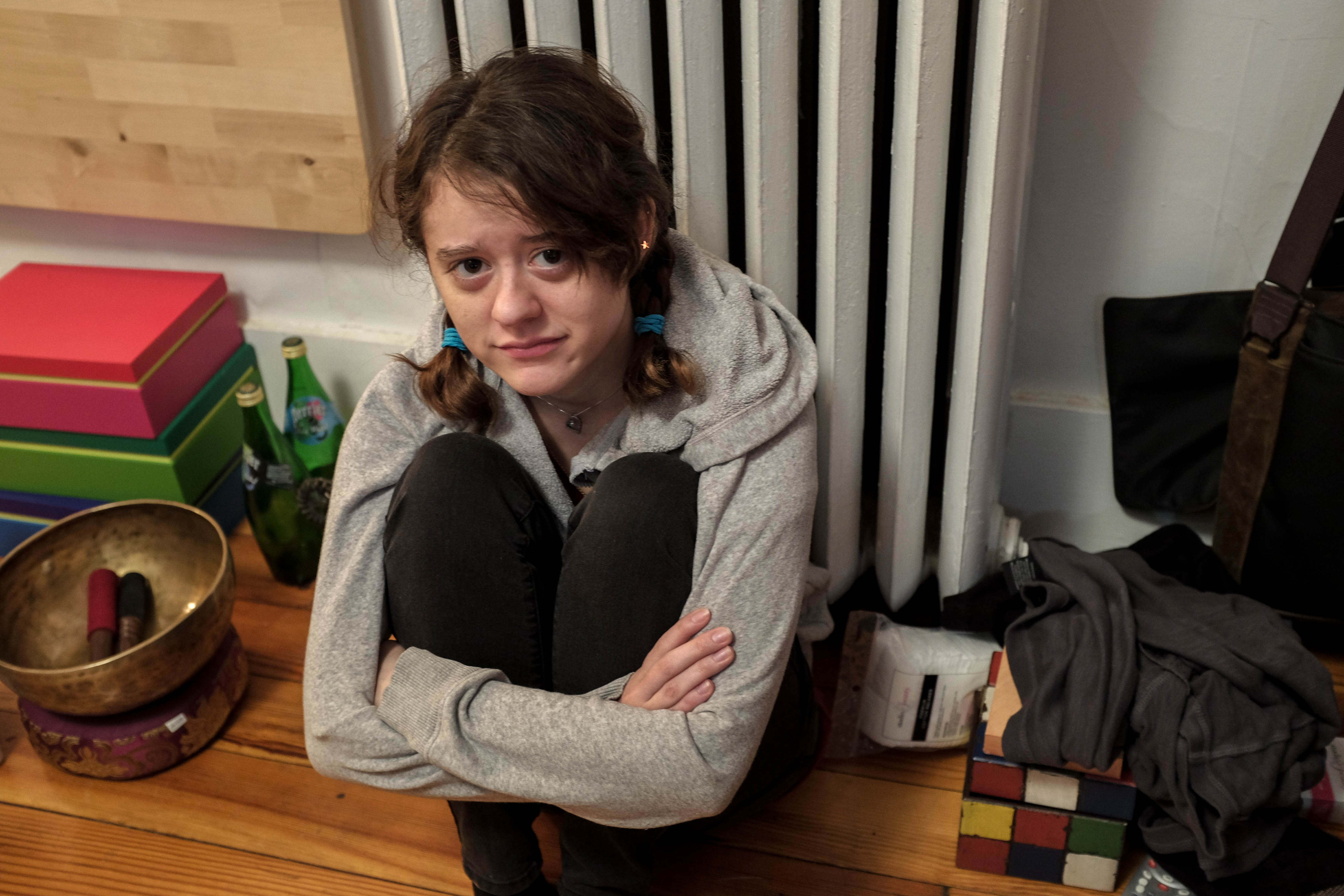 A young woman sits curled up on the floor, her expression reflecting a mix of vulnerability and introspection. The warm lighting contrasts with the cool hues of her gray hoodie, creating an intimate atmosphere amid the clutter of colorful boxes and everyday objects. This composition captures a poignant moment of solitude, inviting viewers to ponder her thoughts and feelings.