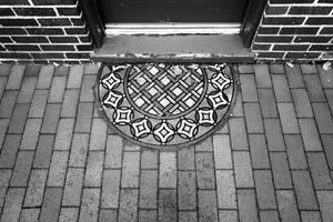 The photograph focuses on an ornate doormat positioned at the entrance of a home, framed by a backdrop of textured, multicolored bricks. The stark black-and-white treatment enhances the intricate patterns of the mat and juxtaposes them against the solid lines of the surrounding bricks, evoking a sense of timelessness and inviting contemplation. The composition draws the eye toward the door, suggesting a threshold that separates the outside world from the comfort within.