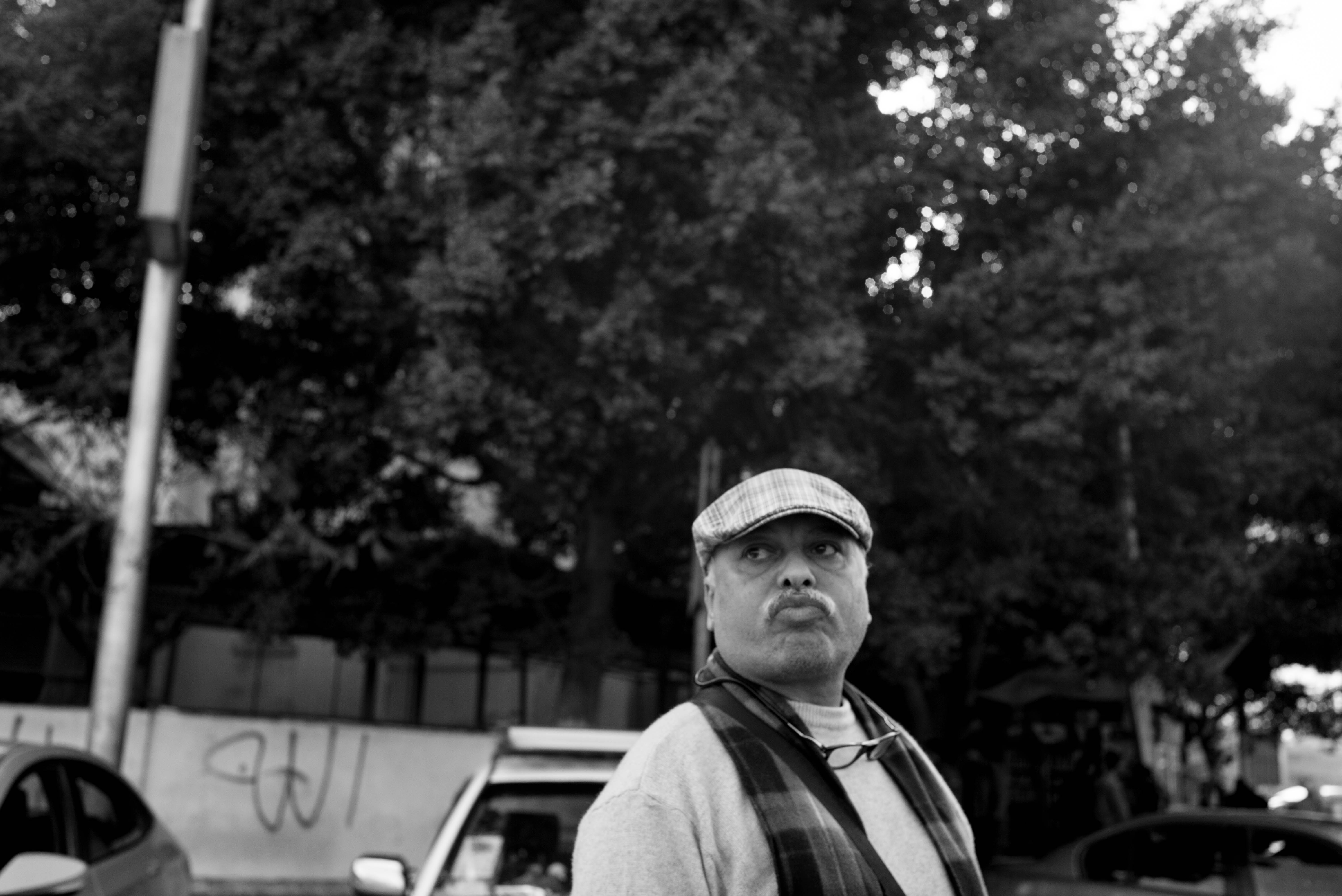 In this black-and-white photograph, a middle-aged man gazes thoughtfully upwards, his expression contemplative amidst a backdrop of lush trees. The soft lighting enhances the subtle textures of his face and attire, while the muted composition draws attention to his intense gaze, evoking a sense of introspection and quiet resilience.