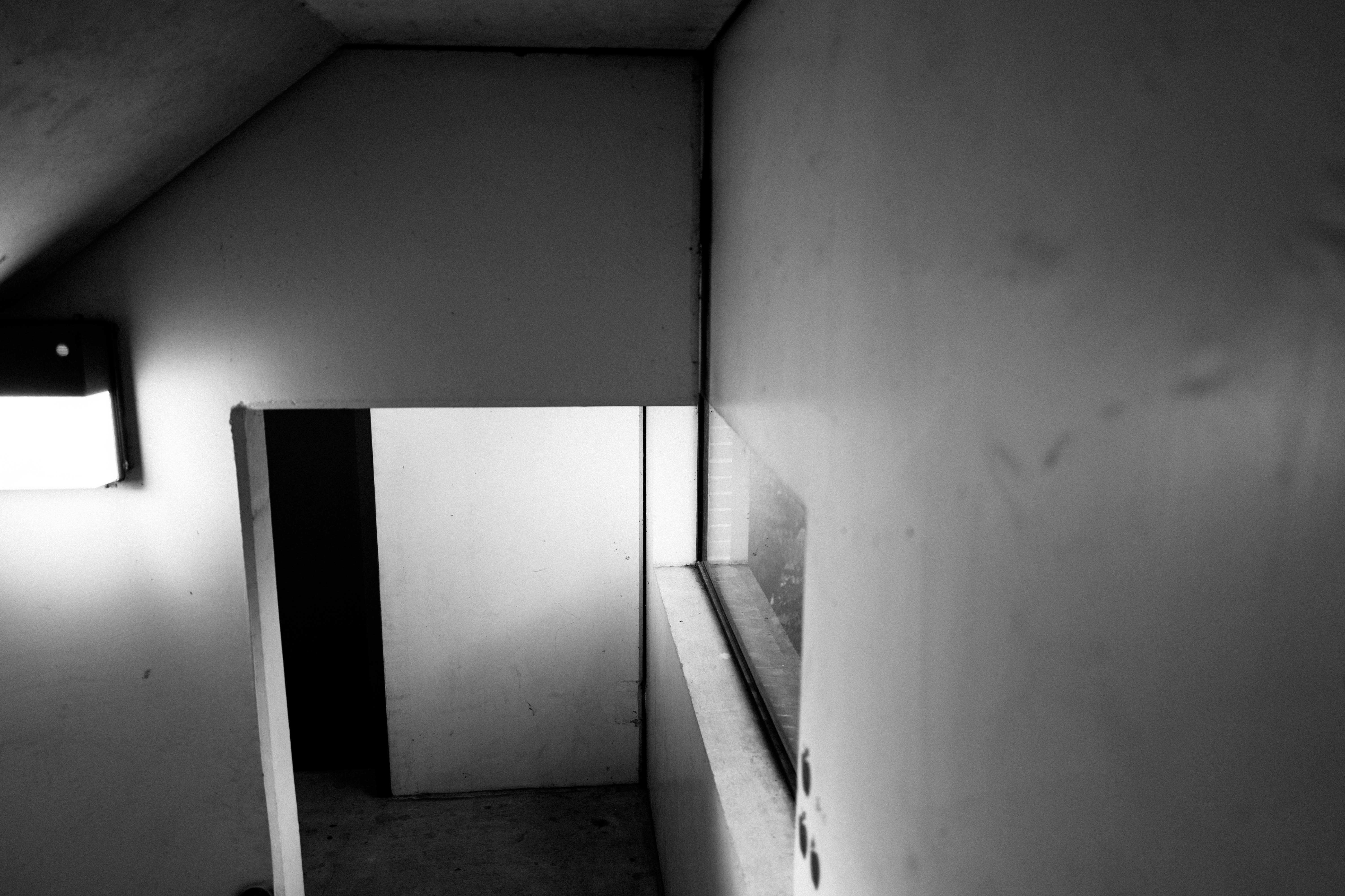 This photograph captures a stark, minimalist hallway illuminated by a solitary light fixture, casting dramatic shadows. The monochrome palette enhances the sense of isolation and quiet tension, drawing the viewer's eye towards the open doorway. The composition invites curiosity about what lies beyond, evoking a contemplative, slightly eerie mood.