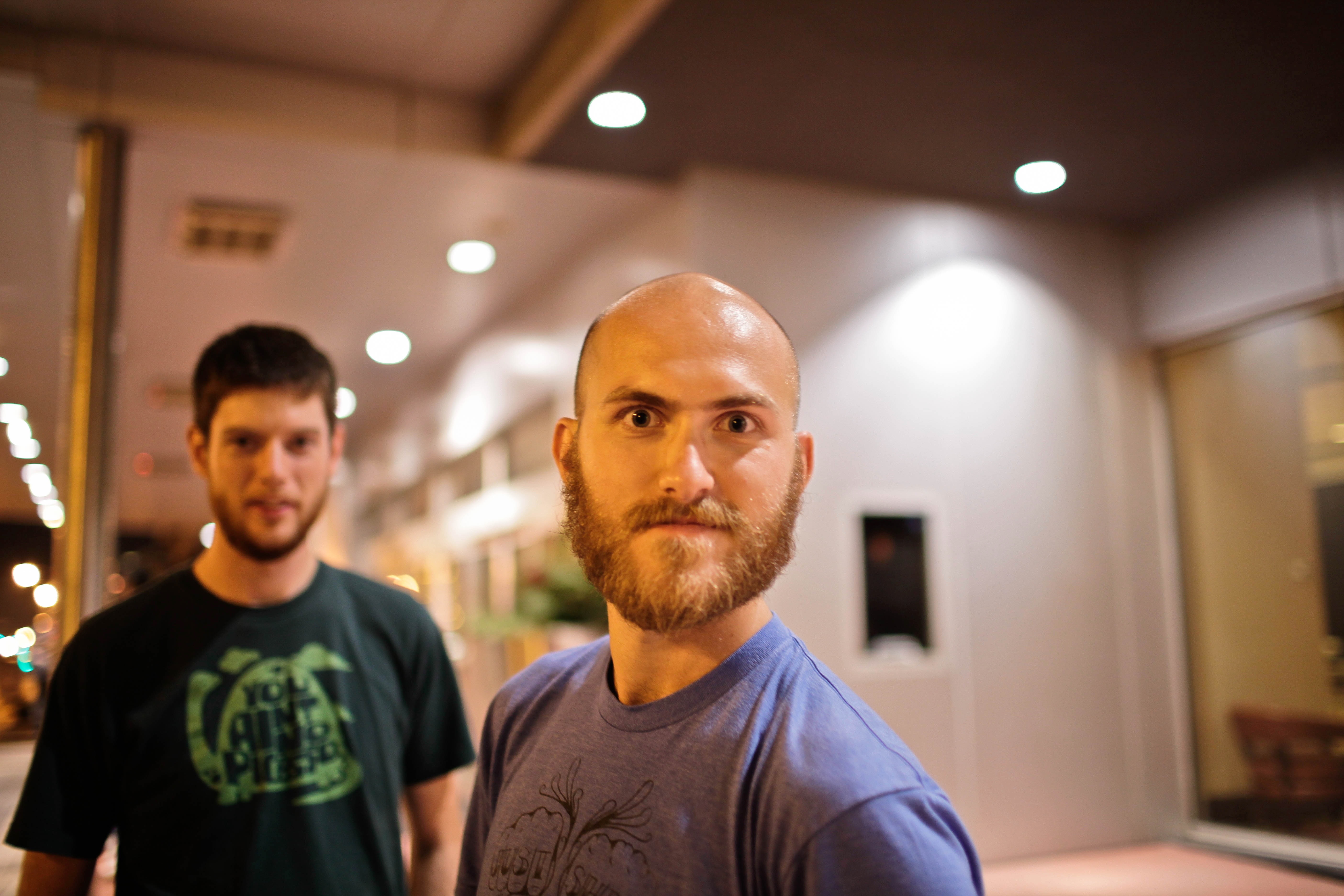 In this intimate nighttime portrait, one man stands boldly in the foreground, exuding confidence with a piercing gaze, while a second figure lingers in soft focus behind him, suggesting a sense of camaraderie or shared moment. The warm yet dim lighting casts gentle shadows, creating a moody atmosphere that enhances the subjects' features and adds depth to the scene. The composition emphasizes the main subject, drawing the viewer's attention to his expression, while also hinting at a larger narrative with the presence of the second figure.