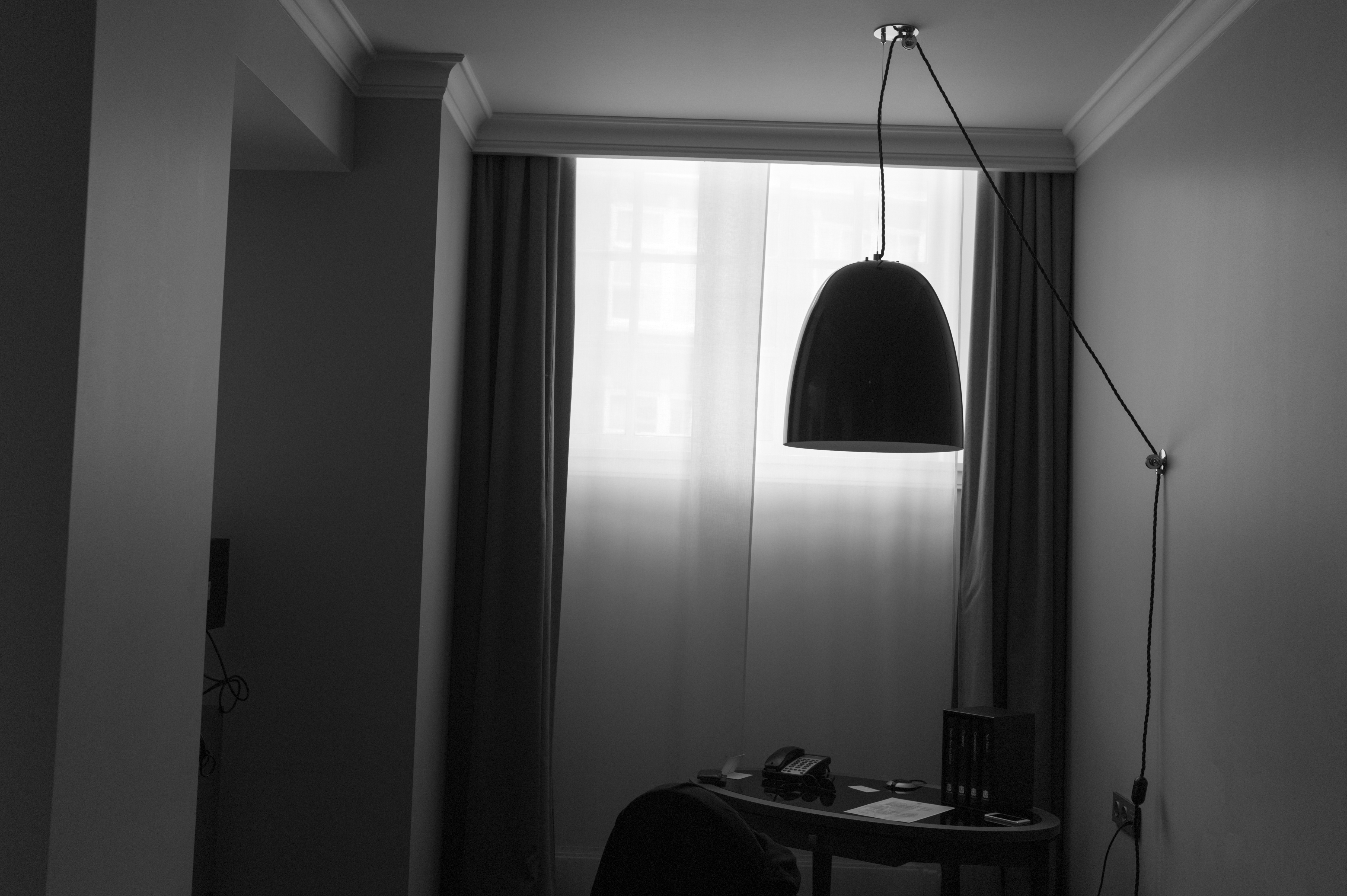 This photograph captures a minimalist corner of a room, featuring a striking black pendant lamp gracefully hanging above a simple wooden table. The diffused light filters softly through sheer curtains, casting gentle shadows and enhancing the tranquil, contemplative mood of the space. The composition emphasizes clean lines and understated elegance, inviting introspection in monochrome tones.