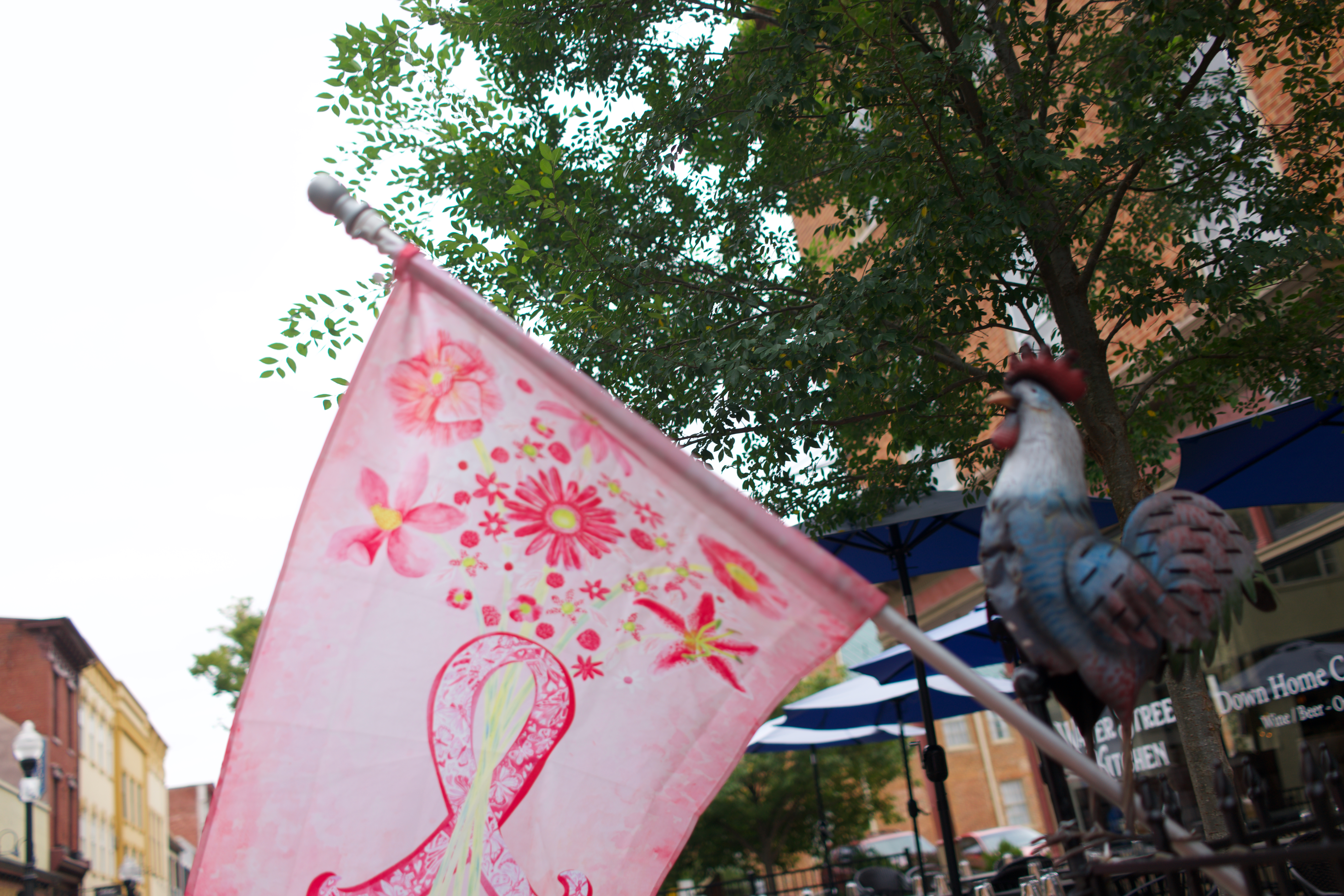 This photograph captures a vibrant pink flag adorned with floral patterns fluttering against a backdrop of greenery and a charming urban setting. A roosting rooster sculpture adds a whimsical touch, infusing the scene with a sense of cheerfulness. The soft, diffused lighting creates a warm atmosphere, inviting a feeling of leisurely enjoyment in the outdoor café space.