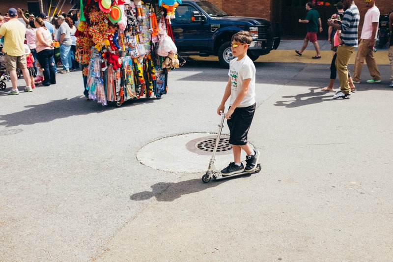 In this lively street scene, a young boy confidently rides his scooter, embodying a spirit of playfulness and independence. The vibrant atmosphere is enhanced by the colorful merchandise display behind him, contrasting with the organized chaos of the bustling crowd. Bright daylight casts soft shadows, highlighting the carefree mood of a day spent enjoying urban exploration.