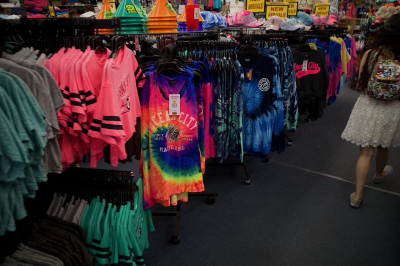 In this bustling retail scene, colorful T-shirts hang in abundance, creating a lively and cheerful atmosphere. The vibrant hues of tie-dye and neon fabrics contrast with the dim ambient lighting, inviting passersby to explore further. A lone figure ambles past, adding a sense of movement to the vibrant display, encapsulating the joy of summer shopping.