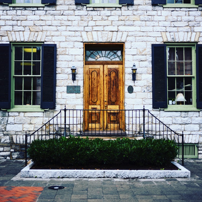 This photograph captures a charming stone facade featuring a richly grained wooden double door that serves as the focal point. The muted lighting creates a serene atmosphere, while the green shutters and well-kept hedges hint at a timeless elegance. The composition invites the viewer to explore an inviting entrance framed by historic architecture.
