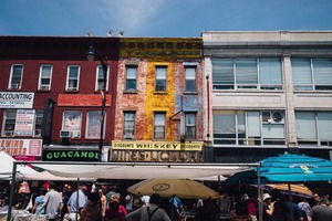The photograph captures a lively street scene dominated by colorful, weathered buildings, bathed in bright sunlight. The eclectic mix of storefronts and bustling crowds conveys an energetic, community-oriented atmosphere, with vibrant hues of red, yellow, and blue starkly contrasting against the clear sky. Umbrellas and market stalls enhance the sense of warmth and activity, inviting viewers into the heart of the urban landscape.