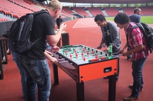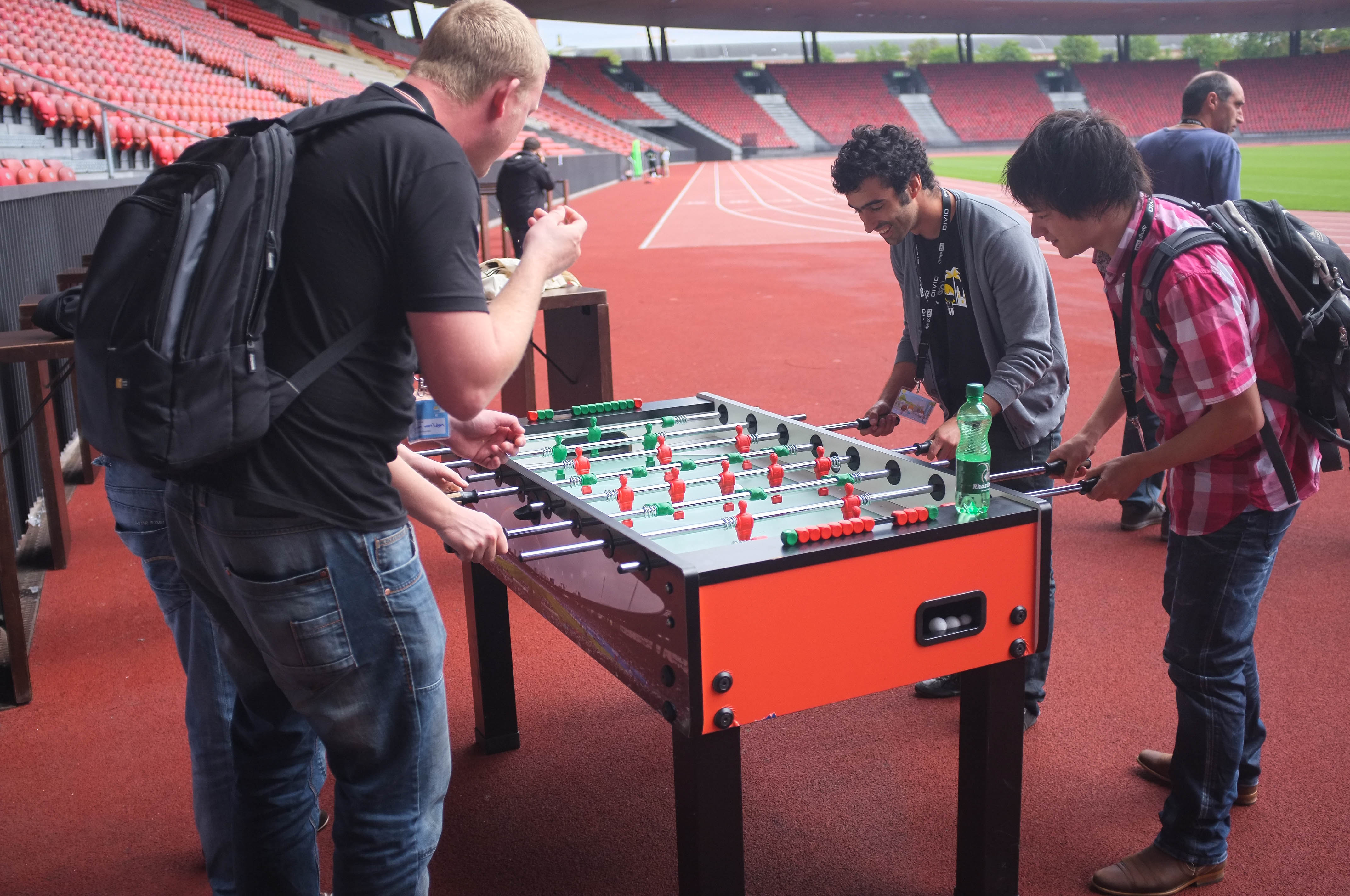 A lively scene unfolds in an empty stadium as four friends gather around a foosball table, their expressions filled with excitement and determination. The vibrant colors of the game contrast with the muted tones of the stadium, creating a playful yet competitive atmosphere. Natural light filters in, enhancing the camaraderie among the players and casting soft shadows on the ground.