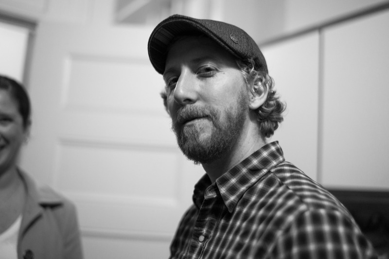 In this intimate black-and-white photograph, a man with a beard and cap stands confidently, gazing slightly to the side. The soft lighting creates an inviting and warm atmosphere, accentuating the subtle textures of his plaid shirt and the gentle contour of his face. A woman partially visible in the background adds to the relaxed, social setting, enhancing the mood of camaraderie.