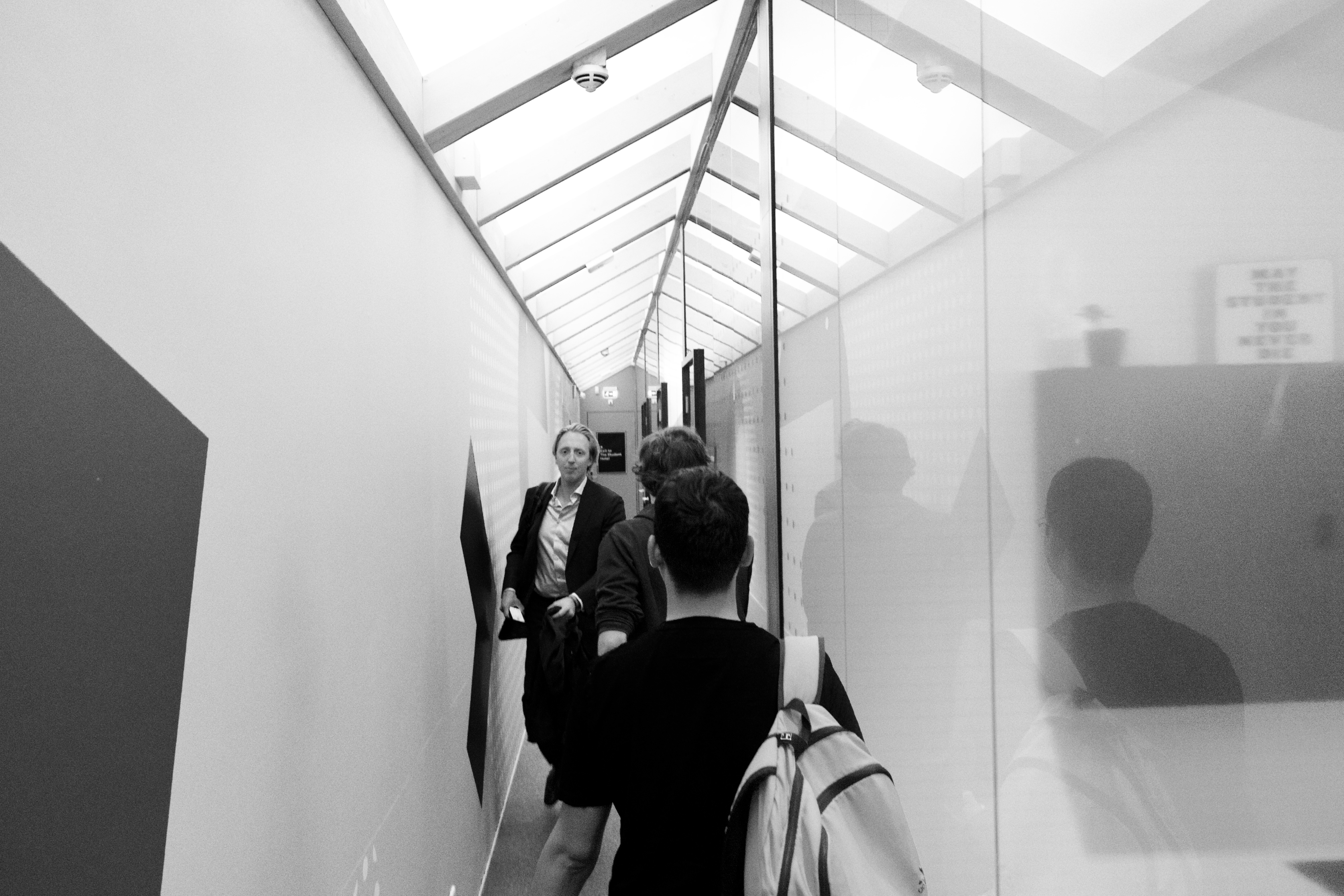 The photograph portrays a narrow corridor flanked by glass walls, creating a sense of depth and perspective. People are seen walking through, their reflections merging with the surroundings, contributing to a mood of movement and transience. The soft, diffused lighting enhances the minimalist vibe, casting gentle shadows that add to the ethereal quality of the scene.