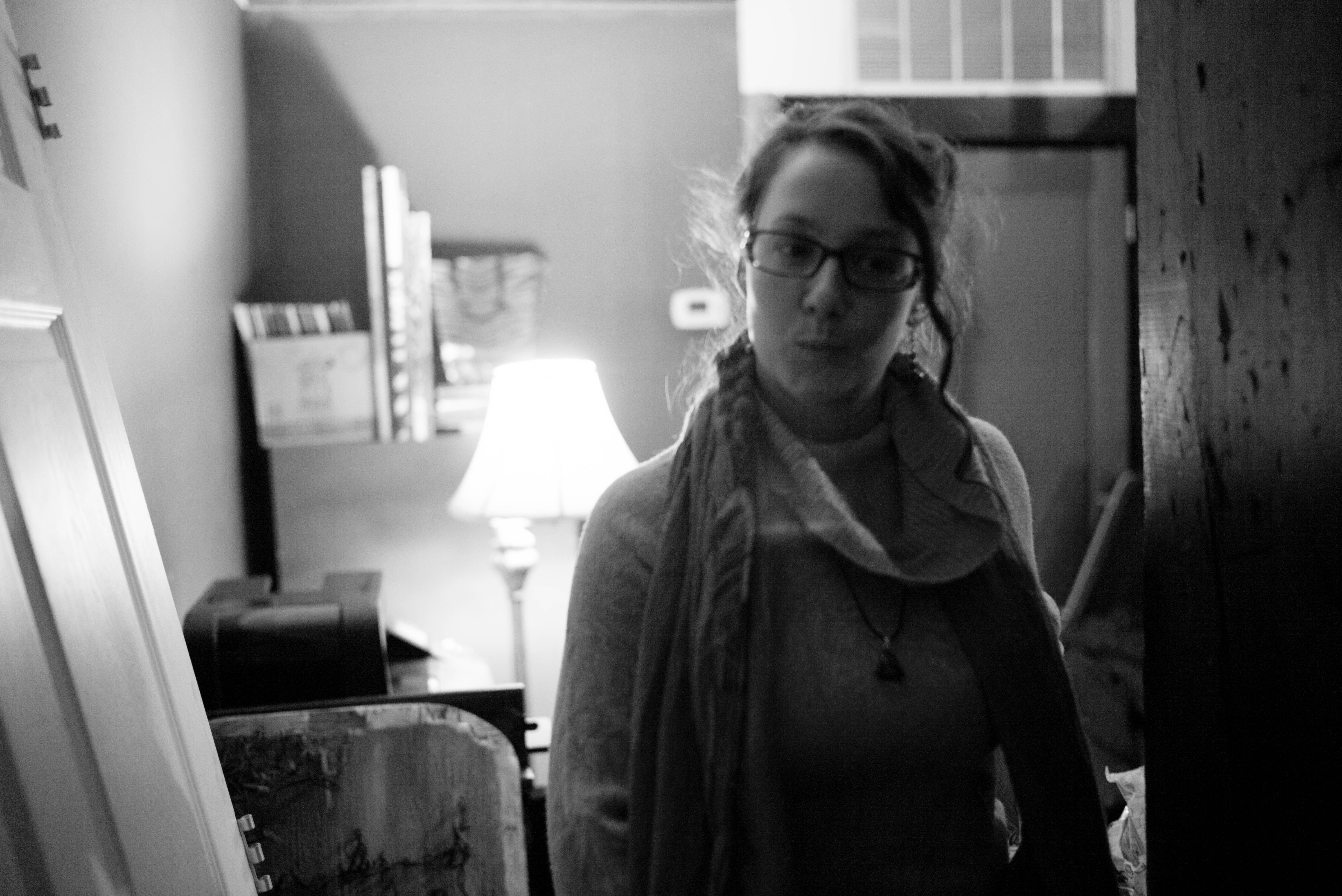In this moody black-and-white photograph, a young woman stands in a dimly lit room, her expression caught between curiosity and introspection. Soft light from a nearby lamp highlights her features, while the surrounding shadows create a sense of depth and intimacy in the space. The composition draws the eye to her thoughtful demeanor, inviting viewers to ponder her story amidst the clutter of the cozy environment.
