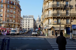 The photograph captures a serene street scene in Paris, where the elegance of historic architecture frames a quiet morning atmosphere. Gentle sunlight bathes the buildings and the iconic dome in the distance, highlighting the rich textures and colors of the environment. A solitary figure stands at the intersection, embodying a moment of contemplation amid the city’s rhythm.
