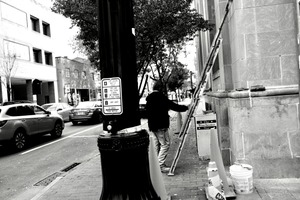 A lone figure ascends a ladder against the backdrop of textured stone and urban architecture, embodying solitude in a bustling cityscape. The monochromatic tones add a gritty atmosphere, accentuating the subject's focus amidst the surrounding vehicular activity. Subtle shadows and the play of light create depth, drawing the viewer's eye to the intersection of human effort and urban life.