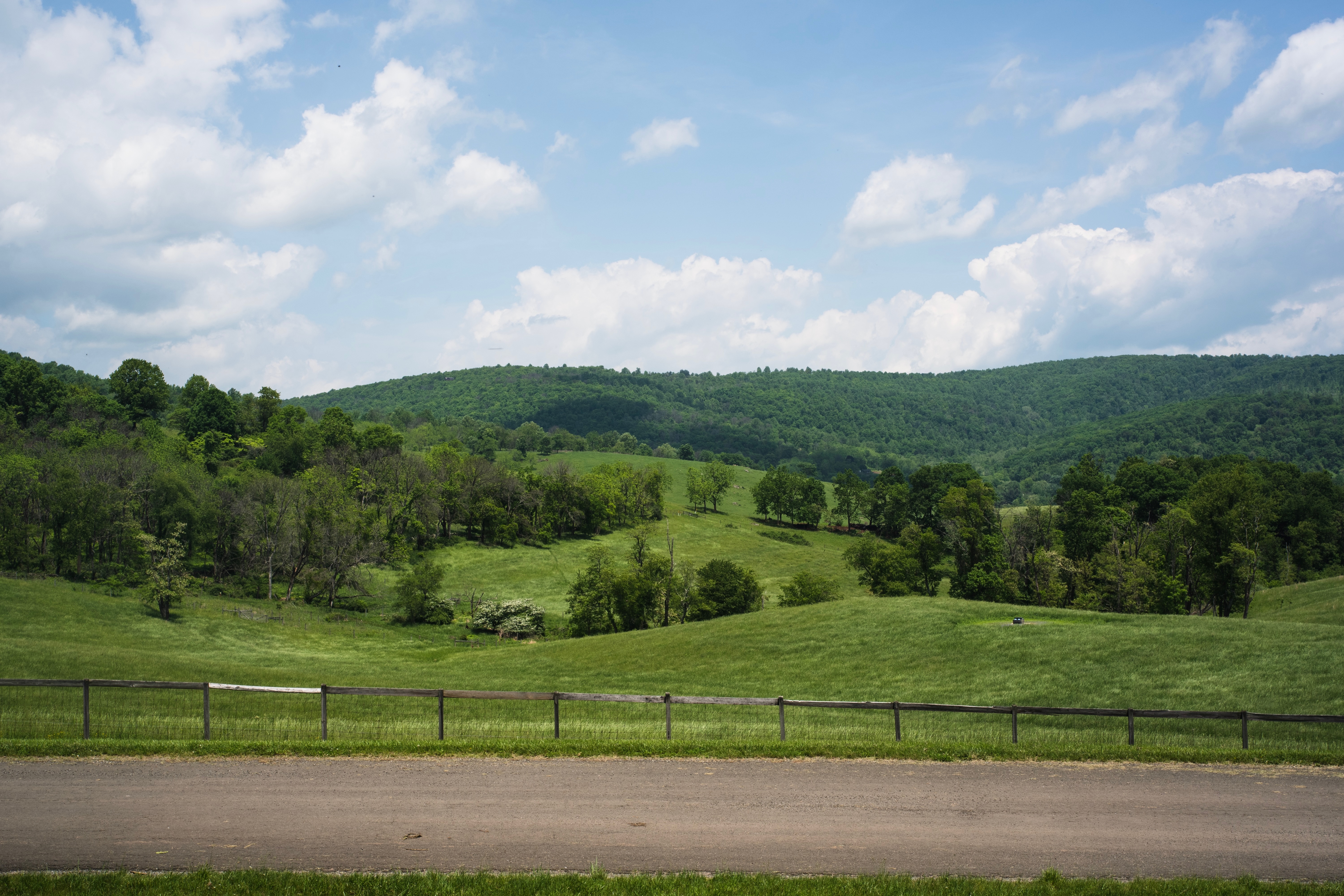 This photograph captures a lush green landscape beneath a bright, blue sky filled with fluffy clouds. The rolling hills create a sense of tranquility, inviting the viewer to breathe in the fresh, open air. The sunlight enhances the vibrant hues of the grass and trees, evoking a peaceful and serene mood.