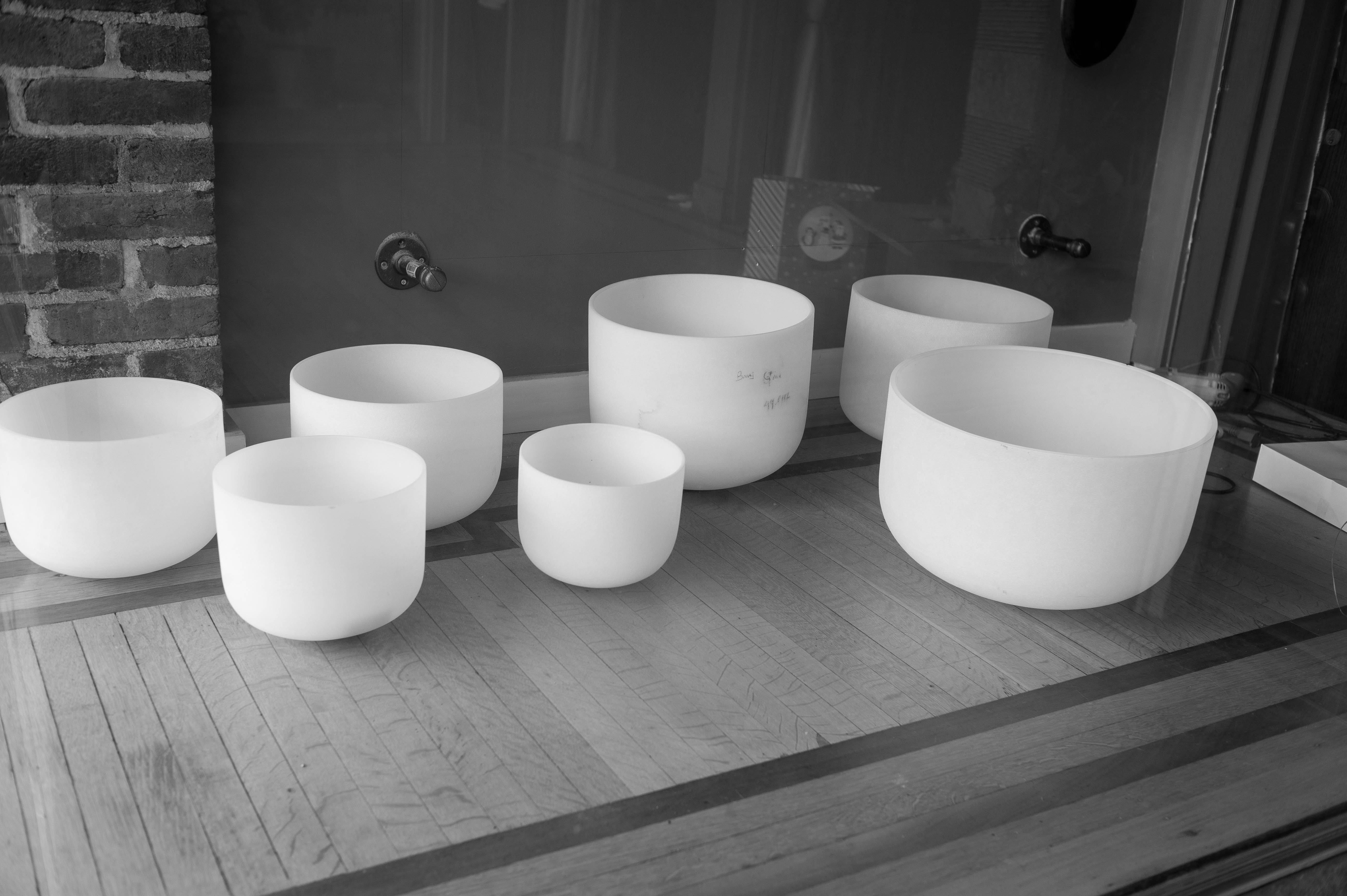 This black-and-white photograph captures a series of ceramic bowls, arranged from smallest to largest, highlighting their smooth, minimalist forms. The soft lighting accentuates the curves and contours of the bowls, creating a serene and contemplative mood among the subtle textures of the wood floor and brick wall. The composition balances simplicity with elegance, inviting the viewer to reflect on the harmony of design and natural materials.