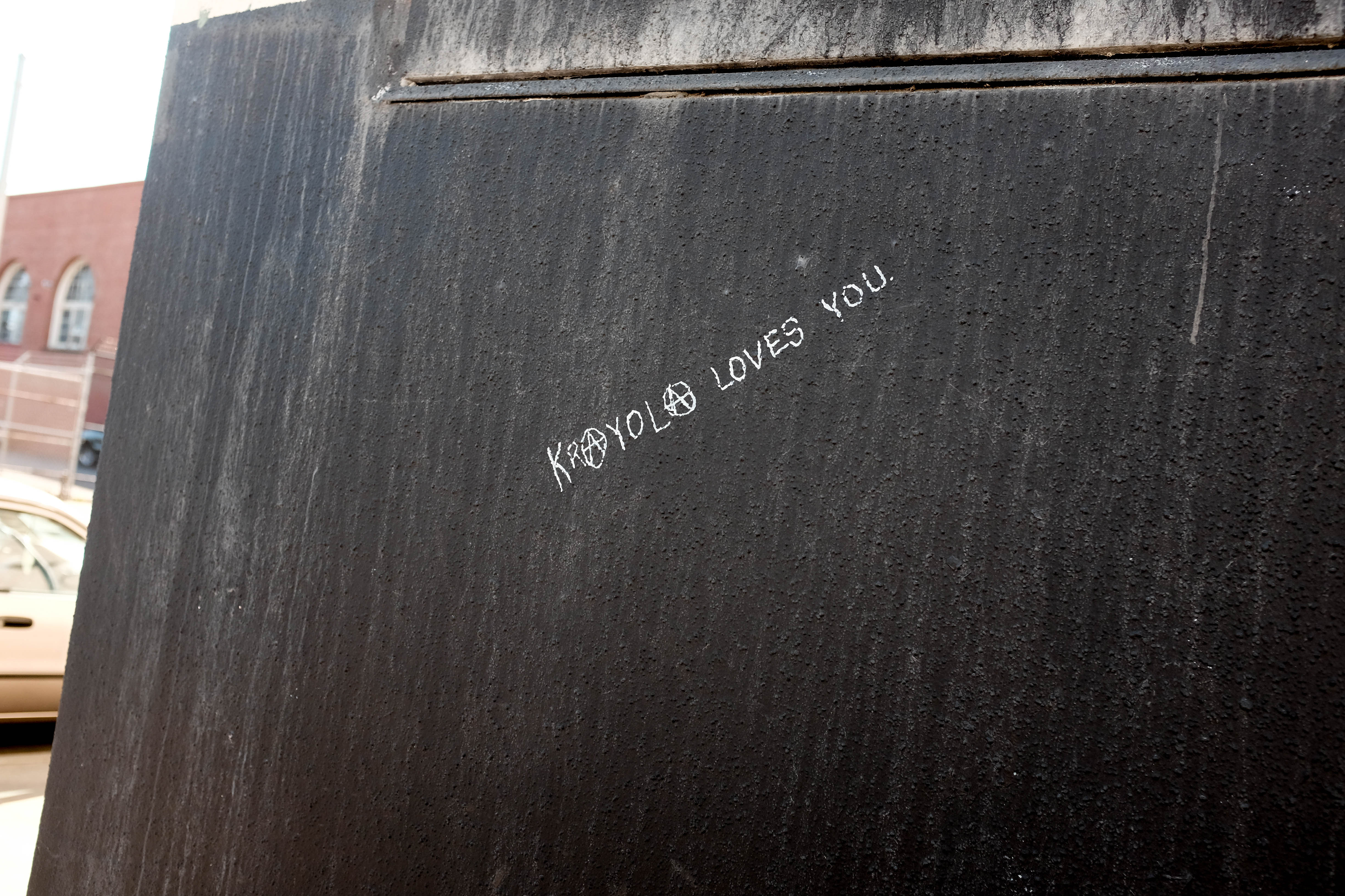 The photograph captures a stark, textured black surface marked by a simple yet striking white graffiti reading 'Krayolo loves you.' The contrast between the dark background and the delicate lettering creates a playful yet edgy mood, inviting viewers to reflect on the often-overlooked expressions of affection in urban spaces. Natural light highlights the grainy texture of the wall, enhancing the sense of anonymity and fleeting beauty in this moment.