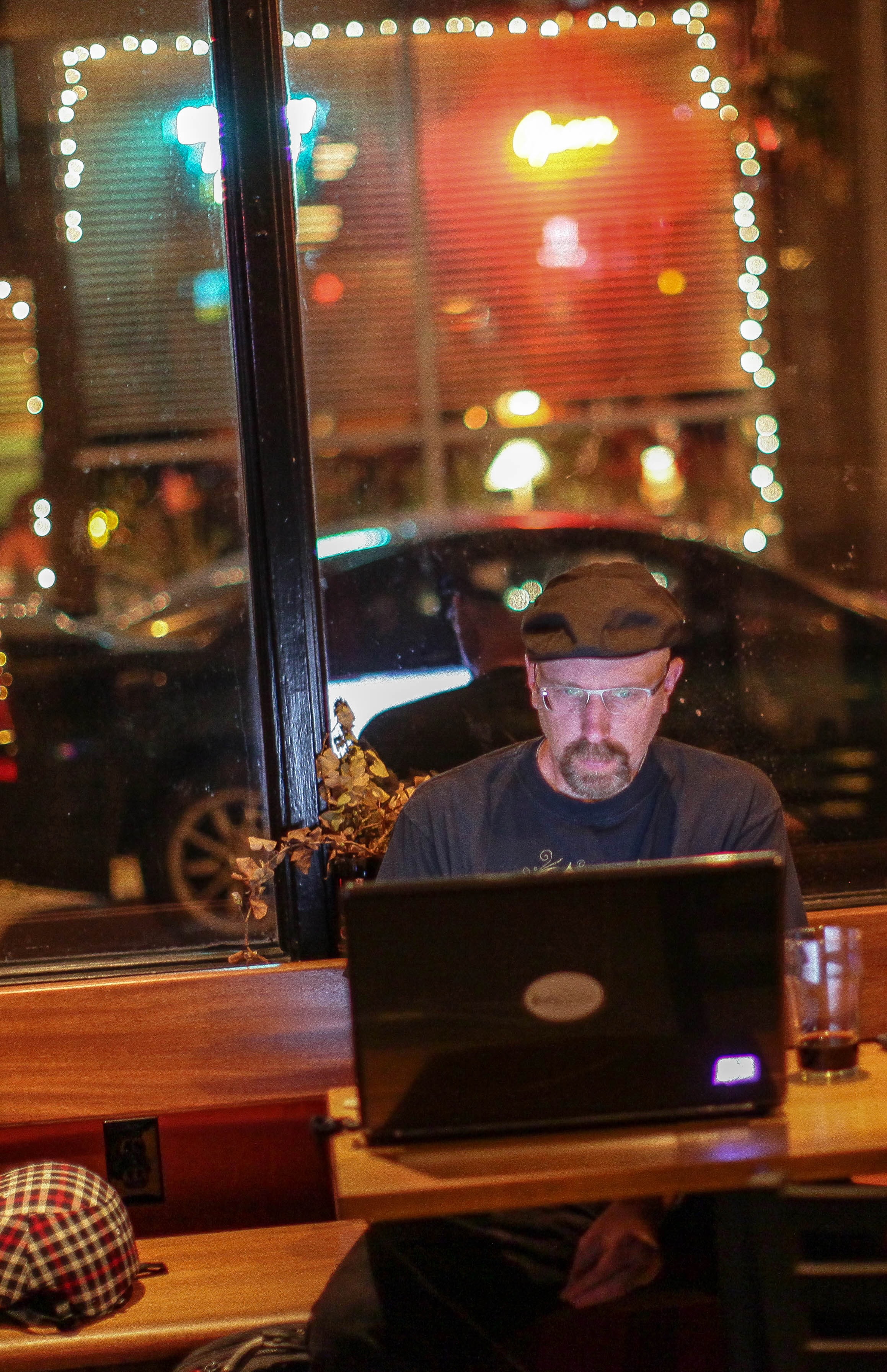 The photograph captures a man immersed in his laptop, seated at a cozy café table. Soft, warm lighting contrasts with the colorful neon glow from the street outside, enhancing a mood of introspection and concentration. Reflections in the window subtly blend the outdoors with the indoor setting, creating a sense of connection yet isolation.