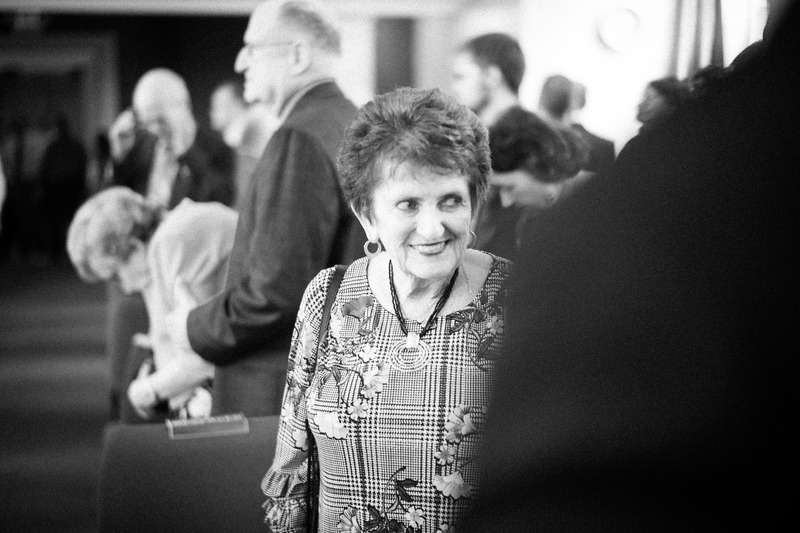 The photograph captures a woman with a warm smile, standing amidst a gathering of people, all engaged in their own conversations. The soft black-and-white tones enhance the intimacy and nostalgia of the scene, while the light gently highlights her face, making her the focal point. The composition conveys a sense of warmth and connection, inviting the viewer into a moment of shared joy and remembrance.