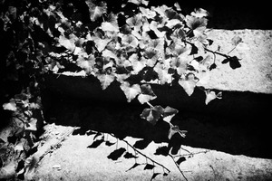 In striking monochrome, delicate ivy leaves cascade over weathered stone steps, casting intricate, elongated shadows that suggest a quiet elegance. The contrast of light and dark evokes a serene and contemplative mood, inviting the viewer to reflect on the slow passage of time and nature's gentle encroachment. The composition harmonizes natural forms with architectural lines, creating a sense of depth and texture.