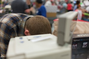 The photograph captures a young man's head bowed low, partially obscured by a printer, suggesting a moment of introspection amidst a bustling retail environment. The surrounding blur of shoppers and products enhances the sense of chaos, contrasting with his stillness. Soft, diffused lighting creates an intimate mood, inviting viewers to ponder his thoughts in a crowded space.