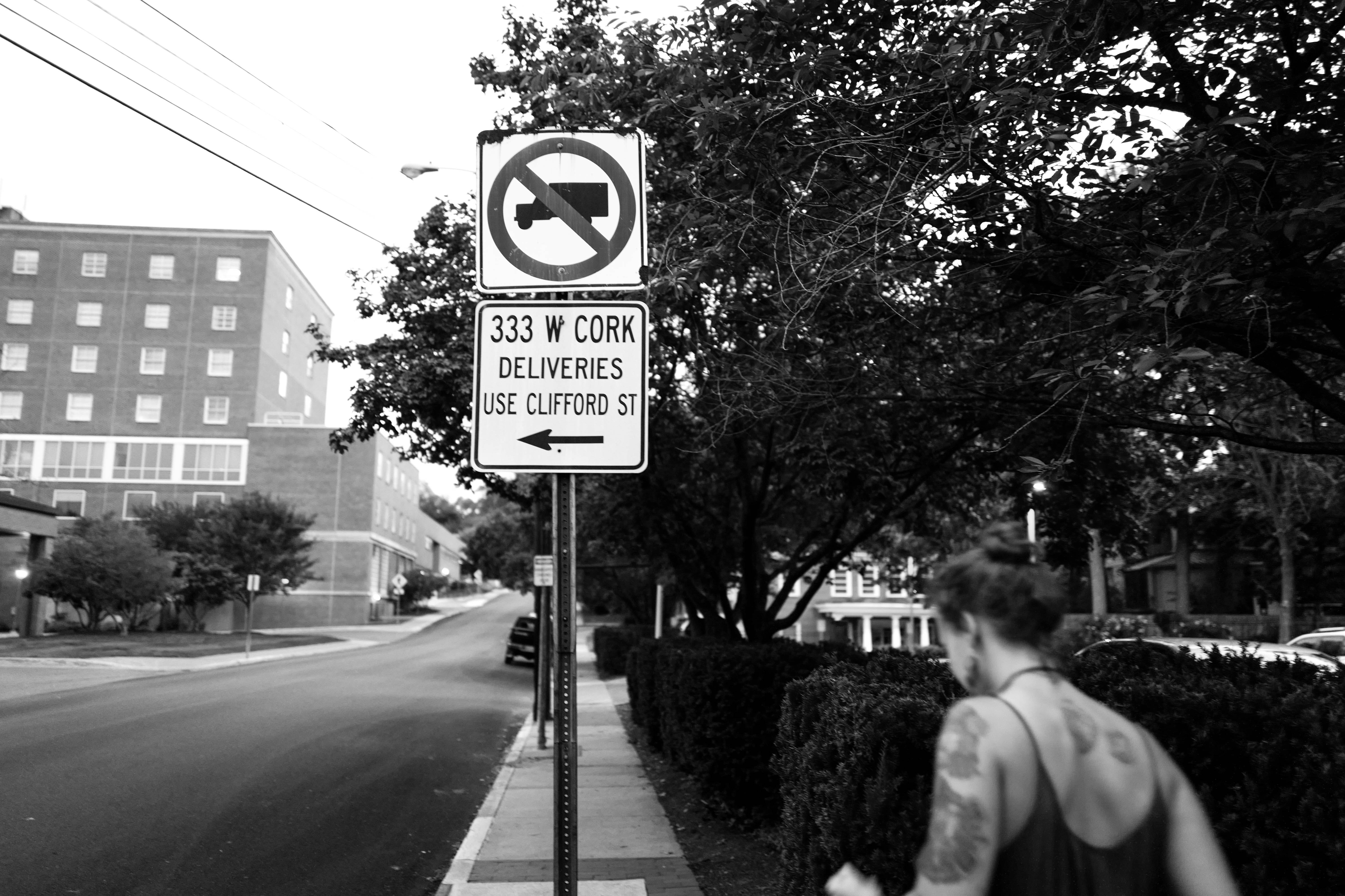 In this black-and-white photograph, a solitary figure walks past a street sign directing deliveries while the street subtly recedes into the distance. The mood is contemplative, embodied by the soft glow of twilight that casts gentle shadows, enhancing the feeling of isolation. The composition, framed by lush greenery and urban architecture, invites contemplation about the intersection of daily life and quiet moments.