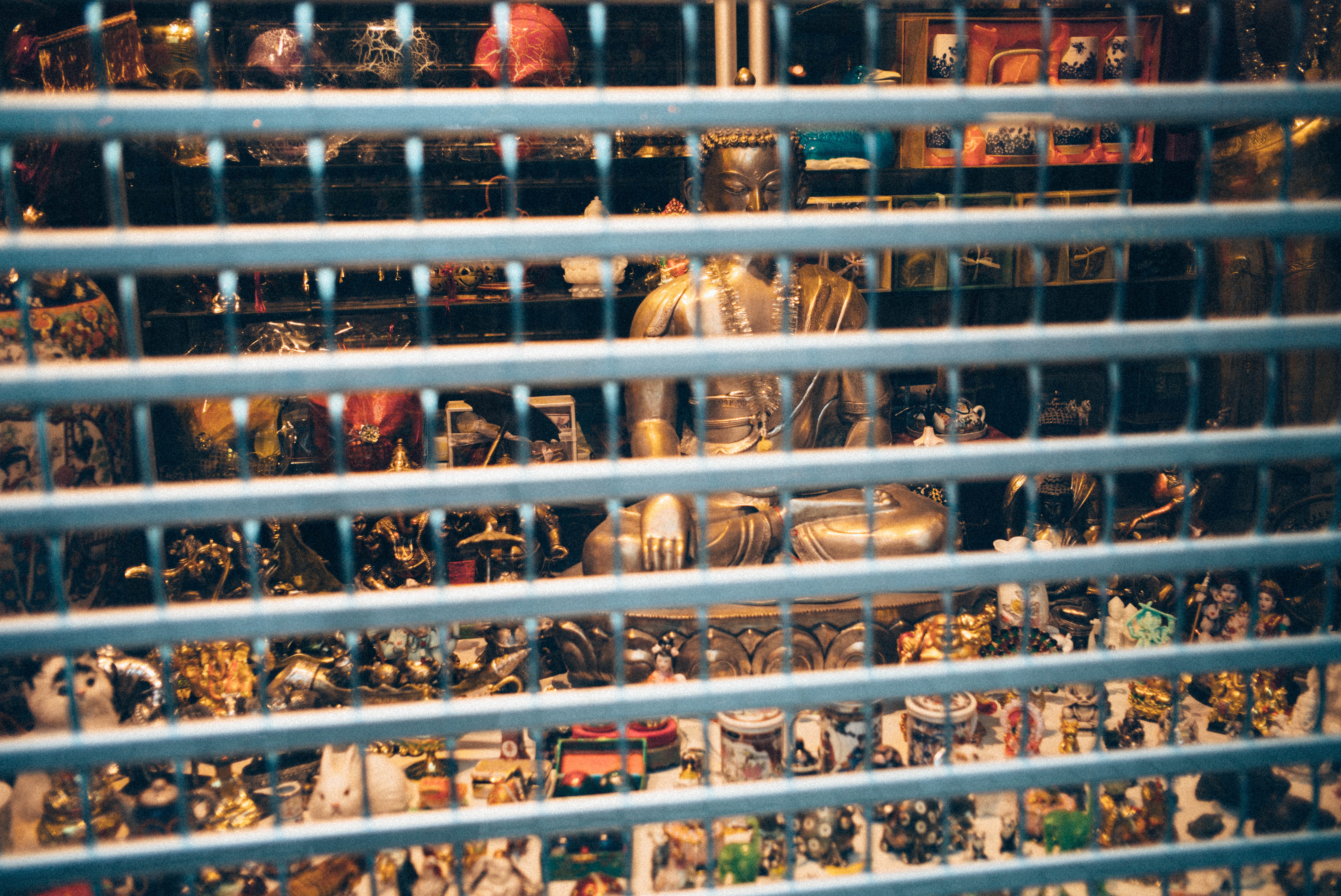 Behind the barred window, a serene golden Buddha sits amidst a clutter of colorful figurines. The warm ambient light casts a soft glow, enhancing the tranquil atmosphere while the grid of shadows evokes a sense of separation and curiosity. The composition invites the viewer to reflect on the juxtaposition of the sacred and the familiar, hidden yet visible.