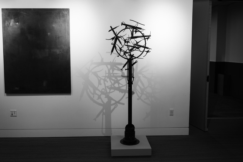 In this evocative black-and-white photograph, a sculptural tree made of twisted branches casts intricate shadows against a stark white wall. The composition is minimalist, with a contrasting dark canvas looming nearby, enhancing the sense of depth and contemplation. The soft yet focused lighting brings out the textures of the sculpture, creating a mood that is both haunting and reflective.