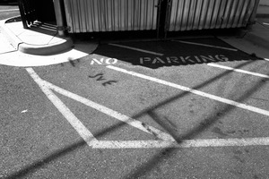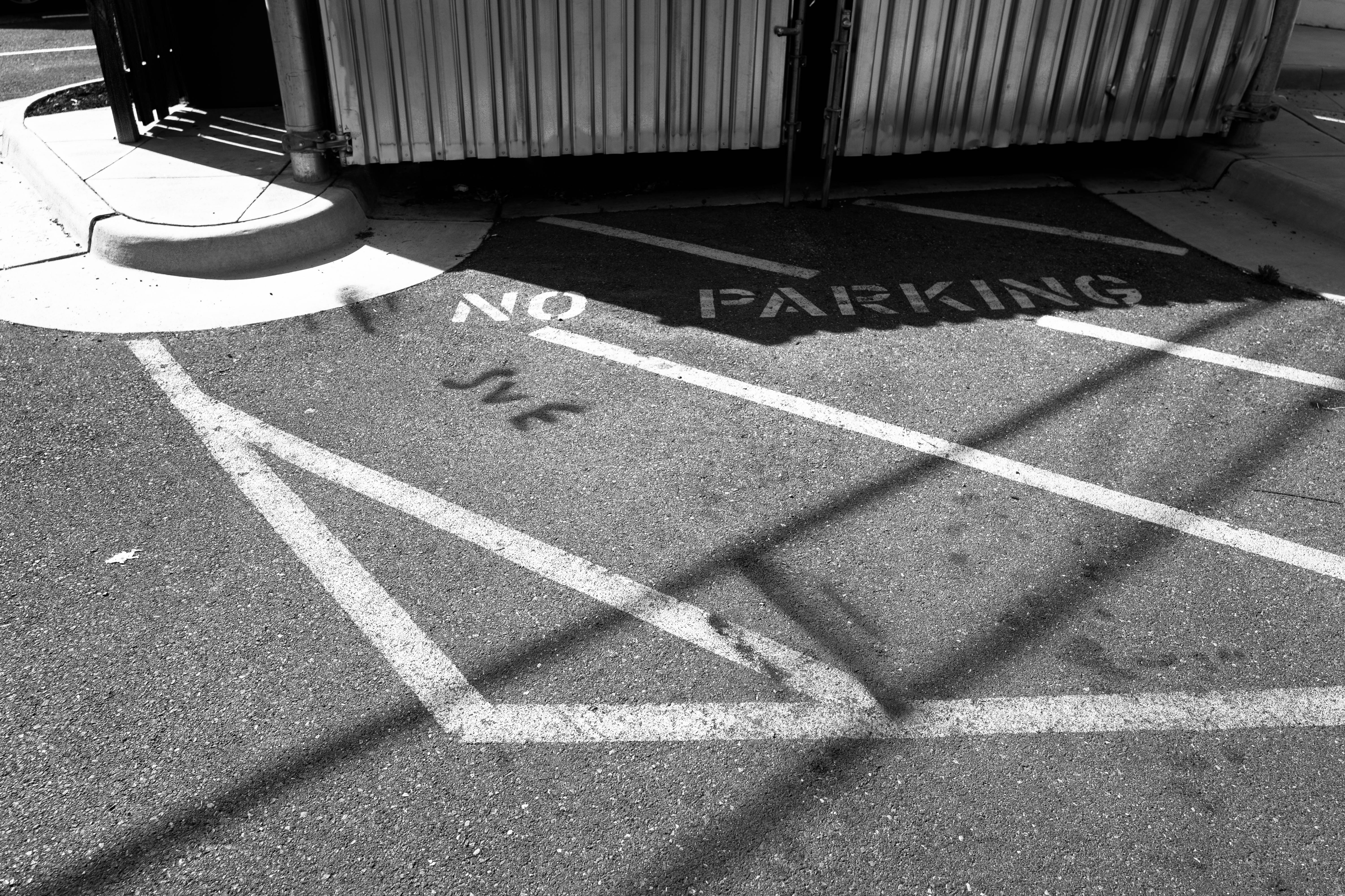 This black-and-white photograph captures an empty parking space marked by bold 'NO PARKING' signs, creating a sense of quiet defiance. Harsh shadows stretch across the asphalt, lending a stark contrast to the industrial setting, while the angle draws the viewer's eye toward the corner enclosure. The mood is contemplative, evoking feelings of confinement and abandonment.