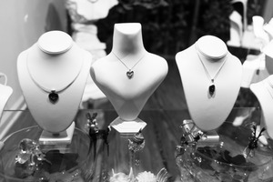 This monochromatic photograph captures three elegant jewelry displays showcasing exquisite necklaces on stylish busts. The soft lighting creates a subtle ambiance, enhancing the shimmering details of each piece, while the blurred background adds a sense of depth and intimacy to the scene. The composition invites viewers to appreciate both the craftsmanship and artistry of the jewelry.