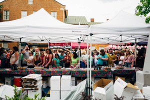 The photograph captures a bustling outdoor market filled with people mingling under colorful tents. The vibrant atmosphere is enhanced by the mix of lively colors worn by the crowd, set against a backdrop of red brick buildings. Soft, natural light filters in, creating a warm and inviting mood as attendees engage in the excitement of the event.