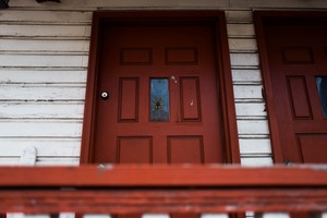 The photograph captures a close-up view of a weathered red door, its vibrant hue contrasting with the faded white siding of the building. A sense of mystery lingers, accentuated by the decorative glass pane that hints at hidden stories within. Soft, natural lighting enhances the door's textures, inviting intrigue while evoking a slightly nostalgic mood.