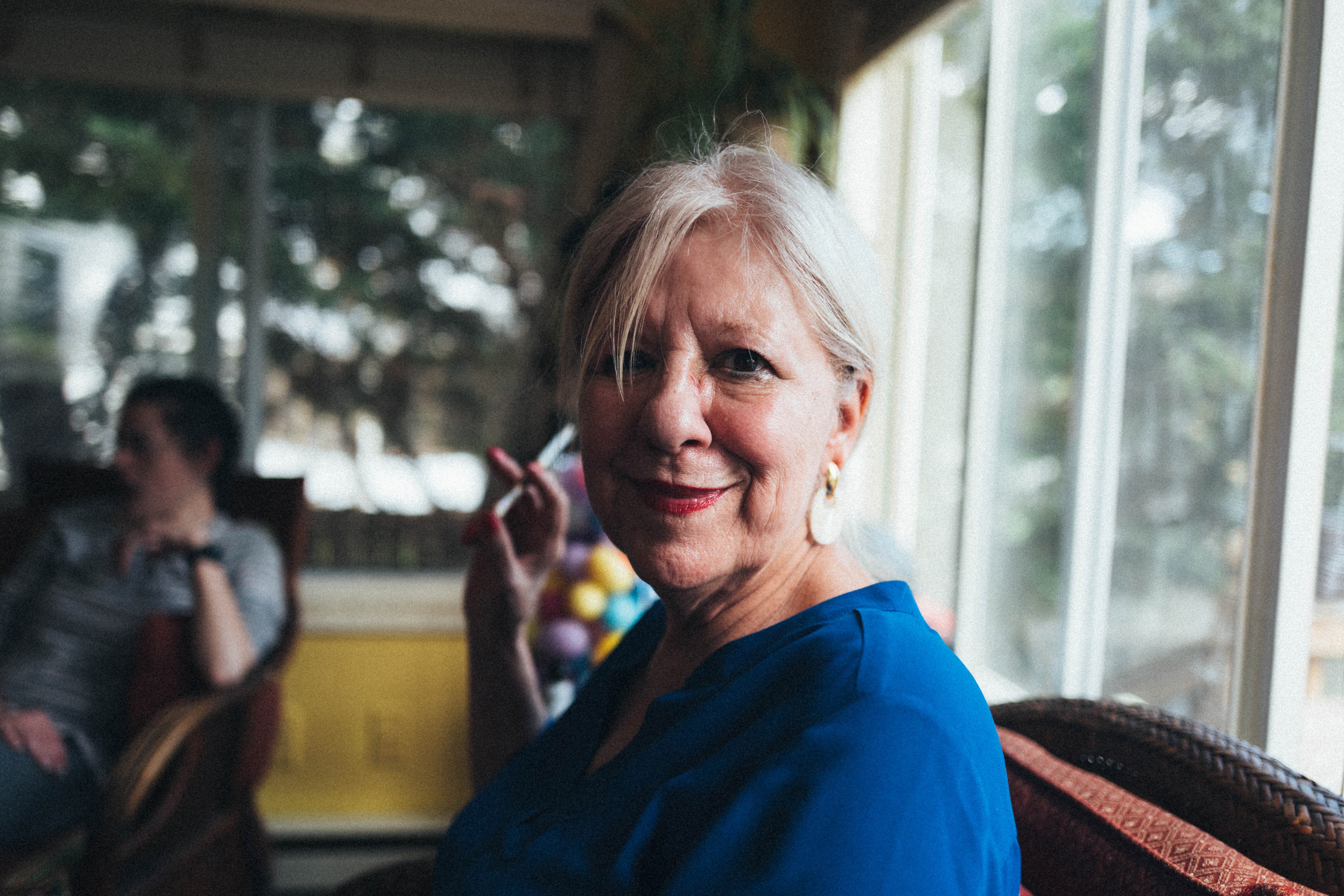 The photograph captures an elderly woman in a bright blue top, exuding a warm and inviting smile. Soft, natural light filters through large windows, creating a calm ambiance that highlights her features. In the background, another figure engages in casual conversation, adding to the intimate, cozy atmosphere of the gathering.