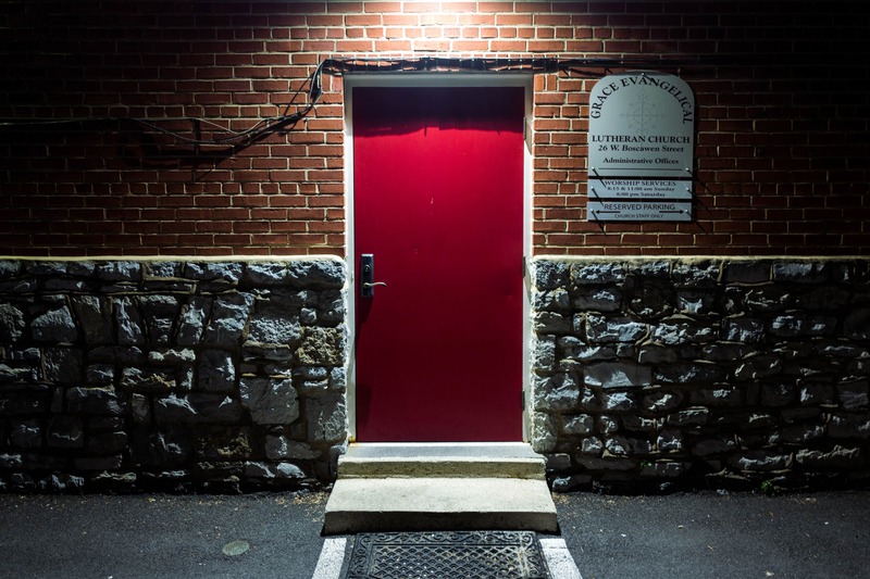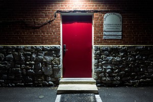 The image features a striking red door framed by textured stone walls and warm brick, illuminated by a stark overhead light. This contrast creates a sense of solitude and contemplation, inviting viewers to reflect on the mysteries that lie beyond. The surrounding darkness enhances the door's prominence, evoking a mood of quiet reverence and intrigue.