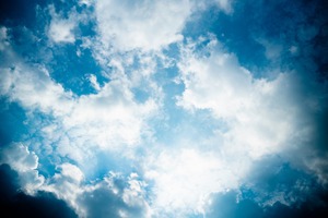 The photograph captures a vast expanse of sky, filled with soft, billowy clouds illuminated by a gentle light. The interplay of deep blues and airy whites creates a serene, almost dreamlike atmosphere, inviting contemplation. The composition draws the eye upward, evoking a sense of wonder and tranquility.