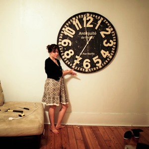 A woman stands playfully beside a large vintage clock mounted on a simple, lightly colored wall. The warm lighting casts a cozy glow, accentuating her cheerful mood and casual style, while the juxtaposition of her soft dress against the clock's bold face creates an inviting sense of nostalgia. The scene is anchored by rustic wooden floors and minimal decor, suggesting a comfort in simplicity.