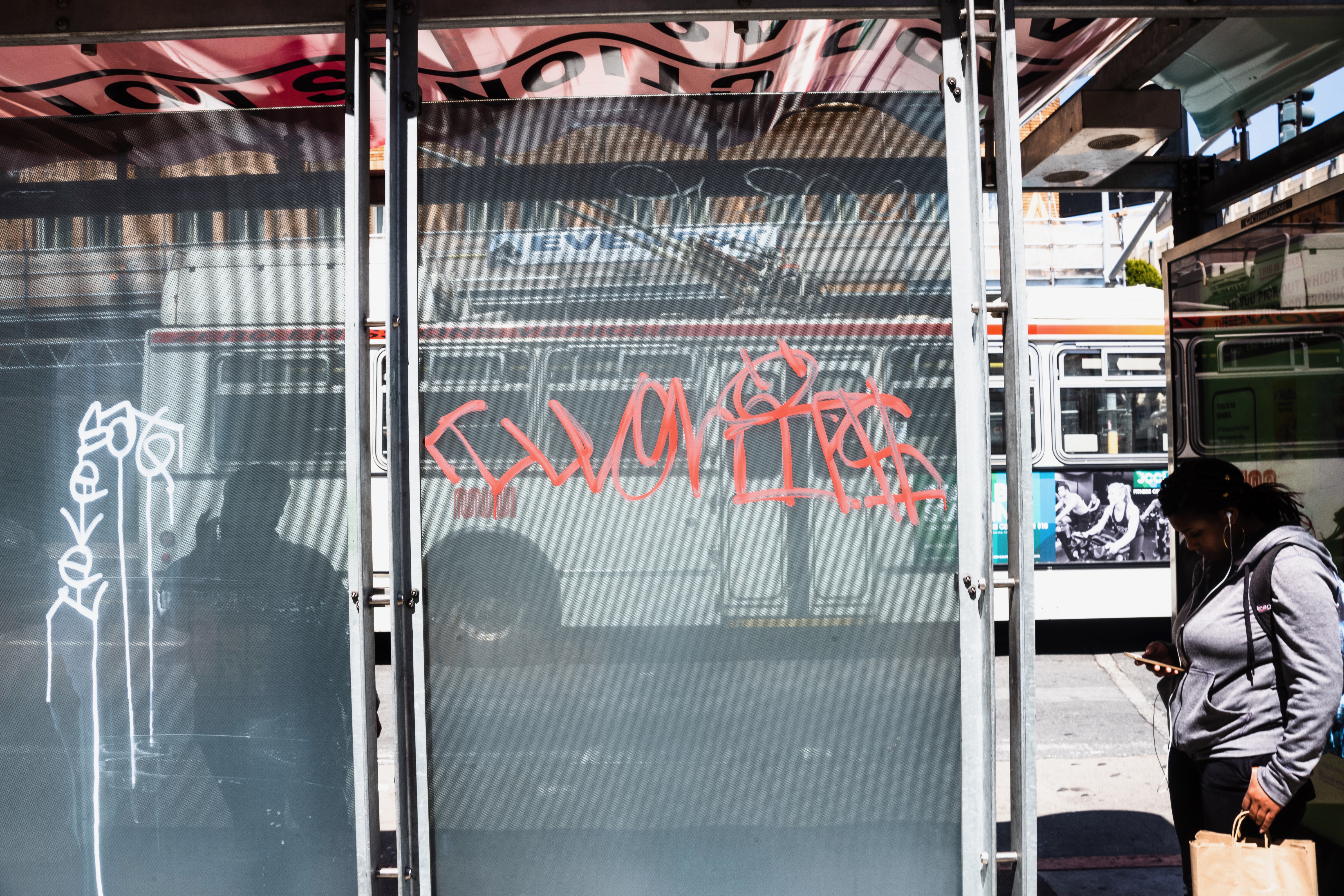 The photograph captures a moment at a bus stop, showcasing the interplay of graffiti and reflections on glass. A solitary figure stands to the right, absorbed in their phone, while a bus's muted silhouette looms in the background, creating a contrast between urban decay and modern life. The bright natural light enhances the scene, giving it a vibrant yet contemplative mood.