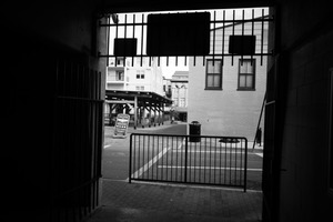 This monochromatic photograph captures a view through a barred gateway, framing a quiet urban scene beyond. The stark contrast of light and shadow creates an atmosphere of confinement, yet the visible street suggests life waiting just outside. The composition draws the eye towards the distant buildings, inviting contemplation of the space beyond the gate.