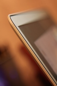 This photograph captures a close-up view of a sleek tablet, emphasizing its refined edges and smooth surface. The soft, warm lighting creates a cozy yet modern atmosphere, inviting contemplation of the device's design. The blurred background adds depth, focusing the viewer's attention on the harmonious interplay of form and function.