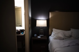 The photograph captures a serene hotel room, dimly lit by a warm bedside lamp that softly illuminates crumpled white bedding and a nearby nightstand. In contrast, the bright light spilling from the bathroom entrance hints at a space both functional and inviting. The overall mood is one of tranquility, offering a glimpse into a moment of solitude and rest.