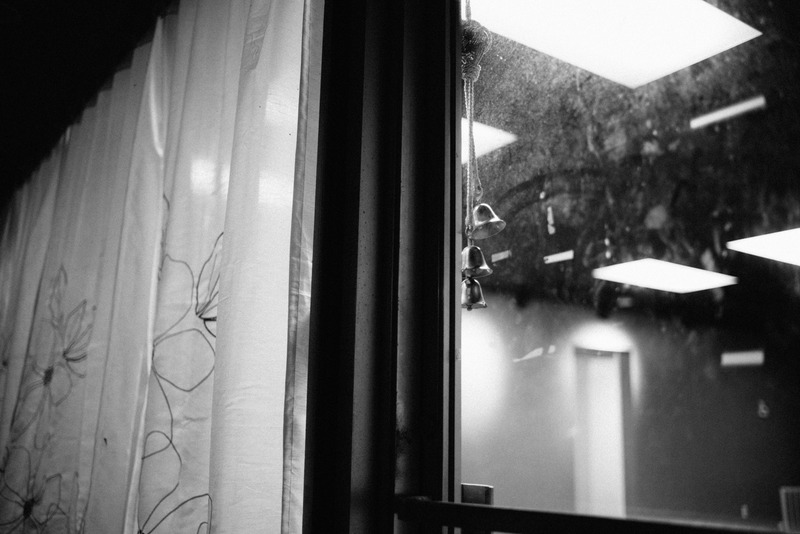 This monochrome photograph captures a partially open window adorned with a delicate curtain, revealing the soft glow of overhead lights beyond. The contrast between the muted, textured fabric and the bright, clinical interior creates a sense of introspection and quietude. A small set of bells hangs near the window, hinting at a story left untold, invoking a nostalgic mood.