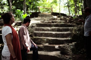 Three figures stand in contemplation before a moss-covered stone staircase leading into a sun-dappled forest. The warm, diffused light filters through the trees, casting a serene mood and highlighting the textures of the stones. The subjects appear engaged in conversation, suggesting a shared moment of discovery amidst the natural beauty.