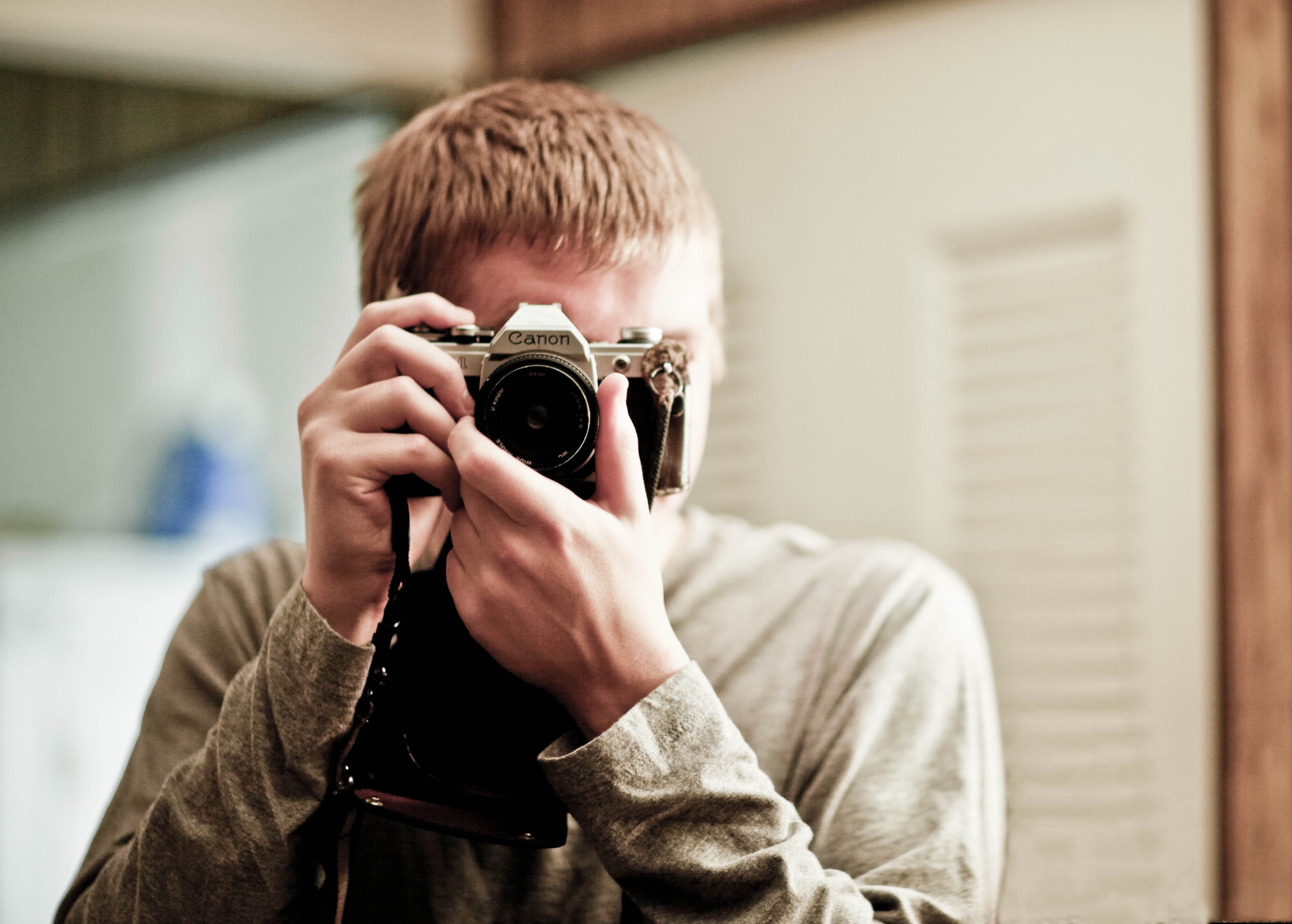 A young man captures himself through an old camera, embodying a moment of self-reflection and creativity. Soft, warm lighting enhances the intimate atmosphere, while the blurred background draws attention to his focused expression. The composition highlights the interaction between the subject and the camera, suggesting a personal connection to the art of photography.