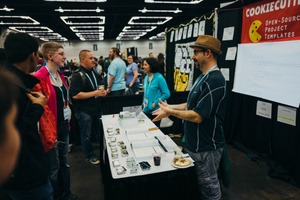 The photograph captures a bustling conference scene where individuals engage around a vendor booth. The warm lighting creates an inviting atmosphere, highlighting animated conversations and keen interest in the displayed materials. The colorful attire of the attendees adds vibrancy, enhancing the overall sense of community and collaboration.
