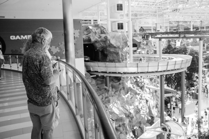 The photograph captures an older man, engrossed in his phone, standing on a curved balcony overlooking a bustling indoor space. The interplay of shadows and light emphasizes the contrast between his solitary moment and the lively atmosphere below, evoking a sense of introspection amidst the excitement. The black and white treatment enhances the mood, adding a layer of nostalgia to the scene.