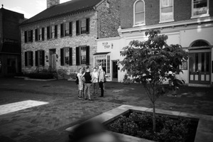 In this black-and-white photograph, a group of five people congregate in a charming urban square, surrounded by historic stone buildings. The mood is casual and friendly, accentuated by the soft lighting that casts gentle shadows across the textured cobblestones. A small tree in the foreground adds a hint of nature, drawing the eye into the scene while framing the social interaction taking place.